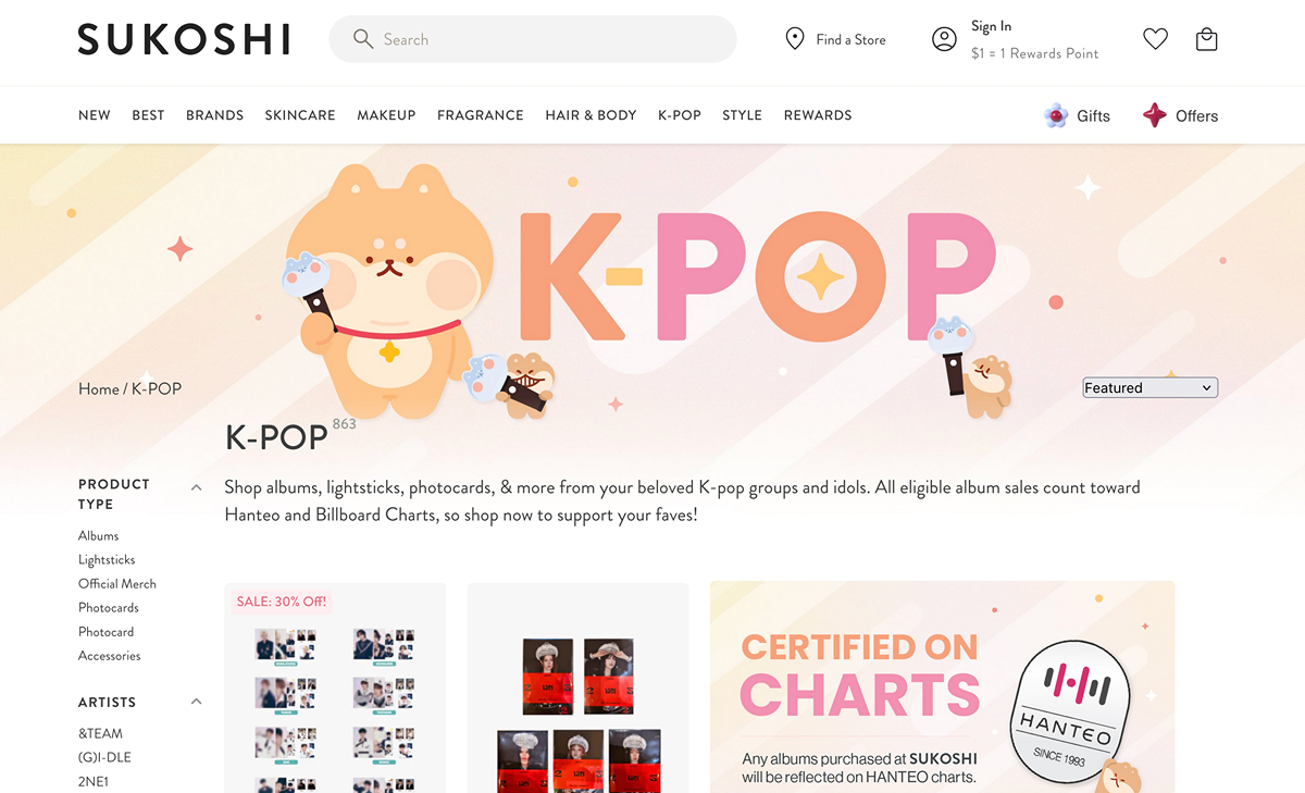 한층 더 놀랄 만한은, 점포의 주요 코너의 하나로서 K-POP의 앨범이나 상품이 대대적으로 판매되고 있어 한국의 「한 테오 차트」인정 마크까지 내걸 수 있고 있는 점입니다.Google로의 검색 결과에서도, 이 회사는 「한국의 화장품을 주된 수입원으로 하고 있다」라고 설명되고 있습니다.