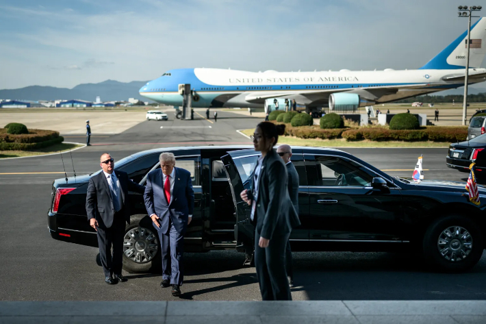 2025년 10월 30일 미중 정상회담 참석을 위해 부산 김해 공항에 도착한 도널드 트럼프 미국 대통령. 미국 백악관 홈페이지 캡처