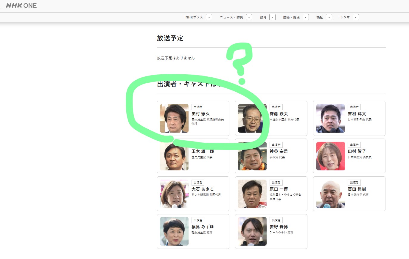 각 정당의 대표가 나와야 되는 NHK의 대표 토론 프로그램에서 자민당 대표는 高市가 아닌 田村 이라는 겉절이가 나왔다.