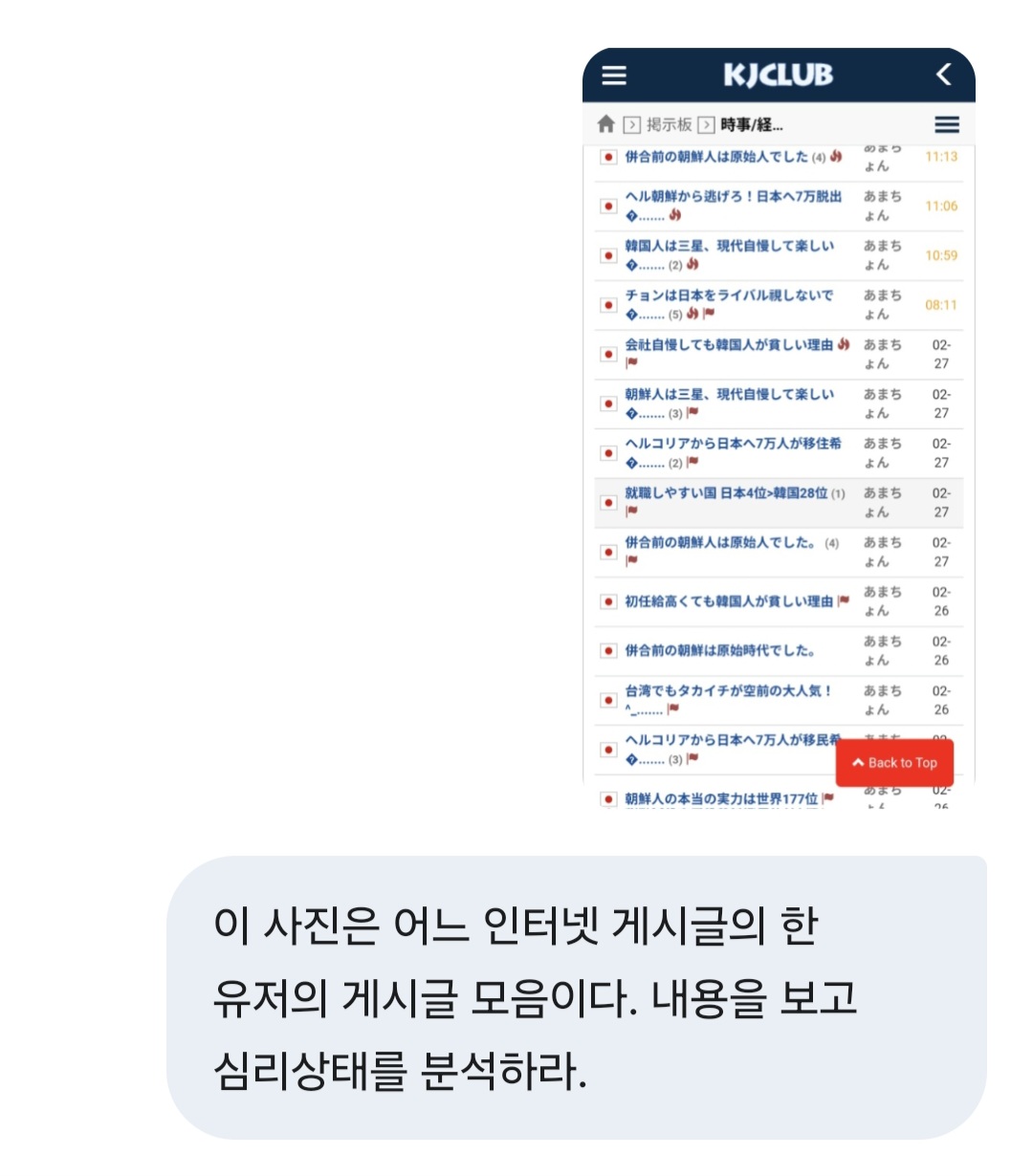 이 유저는 **"현실의 불만족과 내면의 불안을, 특정 국가에 대한 강박적인 혐오와 왜곡된 우월감으로 덮어 가리려는 방어적인 심리 상태"**에 있다고 볼 수 있습니다.