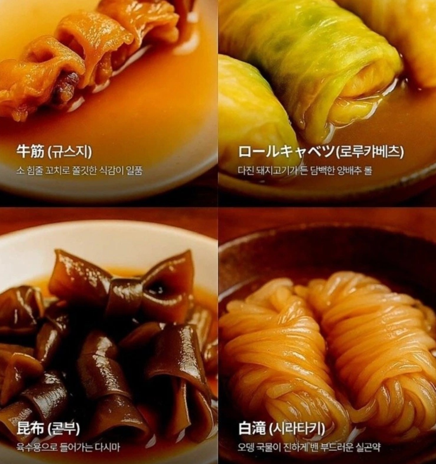 韓国で「オデン」といえば、魚のすり身を薄く伸ばして串に刺したものが一般的ですが、日本の「おでん」は具材の種類が驚くほど多彩です。共有されたガイドには、はんぺん、ちくわぶ、がんもどき、白滝、さらにはロールキャベツやウインナーまで、韓国人の目には「えっ、これも入れるの?」と映るような具材が並んでいます。