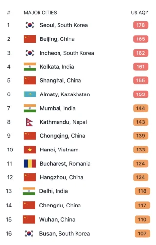 ソウル市が最も空気の質が悪い国1位を獲得しました。