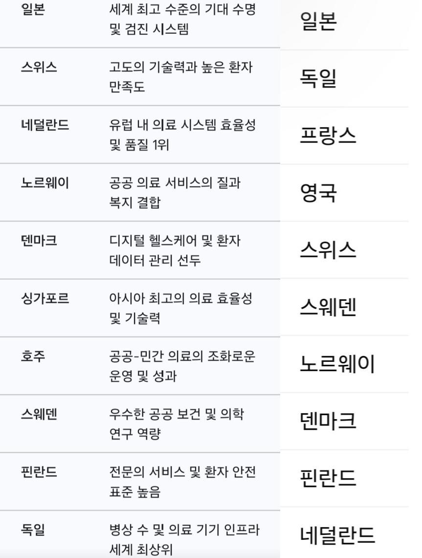 최신의 AI(Gemini 및 ChatGPT)의 데이터를 기본으로, 세계의 의료 선진국 Top10가 발표되었습니다.양AI의 공통 인식으로서 선출된 상위국은 이하와 같습니다.