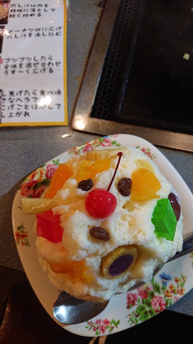 もんじゃ焼きと白熊が同時に運ばれて来たので