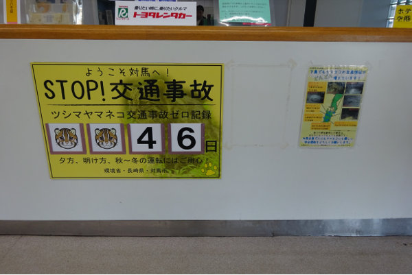 렌트카의 코너에, 「트시마야마네코 교통사고 제로 기록 46일」의 게시.이 게시는 시마우치에서 몇회인가 눈에 띄었지만, 사상사고의 게시는 보지 않았다.대마도에서는 인명보다 트시마야마네코가 소중한가?(