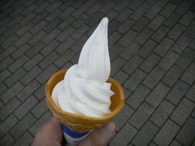 マザー(mother)牧場の、新鮮な牛乳を使った、ソフトクリーム(soft serve)を買い食い。一個ずつ食べました。美味しいです。