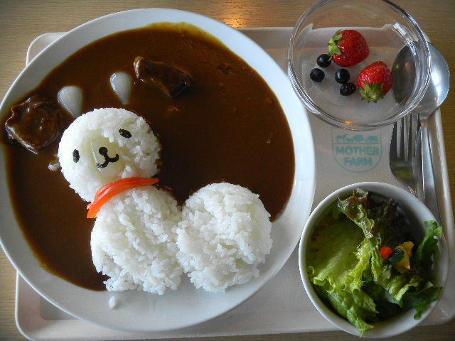 アルパカ(alpaca)をイメージした、牛肉(beef)カレー(curry)。一人一皿ずつ(二人共、同じ物(アルパカ(alpaca)をイメージした、牛肉(beef)カレー(curry))を、食べました(写真は、一人分))。見た目は、可愛いのですが、カレー(curry)の味は、完全に、動物園や遊園地の、レストラン・食堂で、有り勝ちな(よくある)、工場で生産したレトルト(袋のまま、熱湯で温めるか、袋から出して、電子レンジ(microwave)で温めれば完成する、保存食品)の、若しくは、レトルト的な、味でしたw 不味くはないのですが、値段的には、手作りのカレー(curry)と変わらない値段であるので、もう少し、努力すれば(レストランで、ちゃんと手作りすれば)良いのにと思いますw