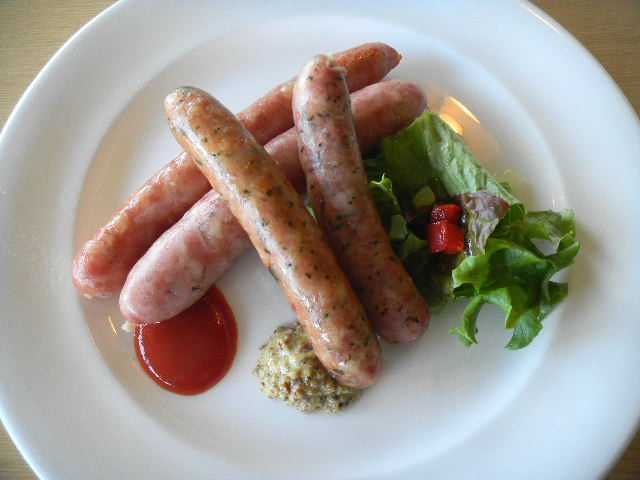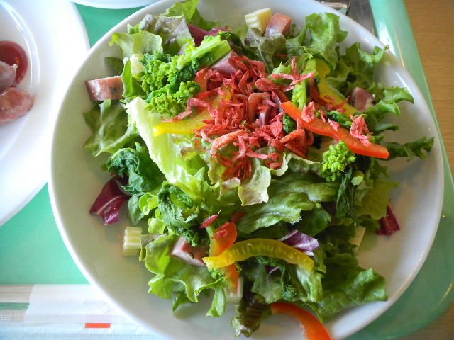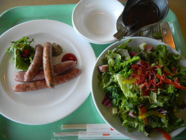 写真以下3枚。サラダ(salad)と、マザー(mother)牧場の、手作りのソーセージ(sausage)。二人で分けて食べました。