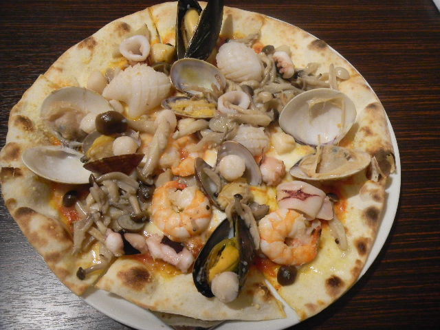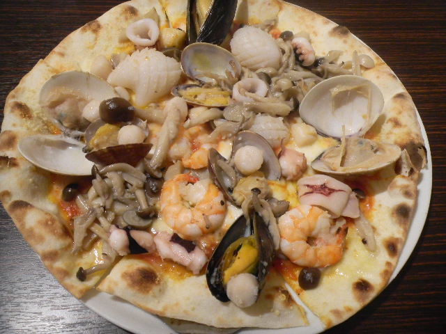 写真以下2枚。新潟(niigata)県(日本の中部地方の北端に位置する県)産の茸と、魚介類(seafood)の、ピザ(pizza)。