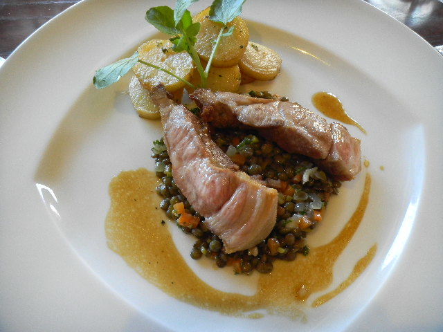 私が食べたメイン(main)料理。豚肉(肩ロース(肩loin))のポワレ(poele)、レンズ豆(lentil)、仕立て。