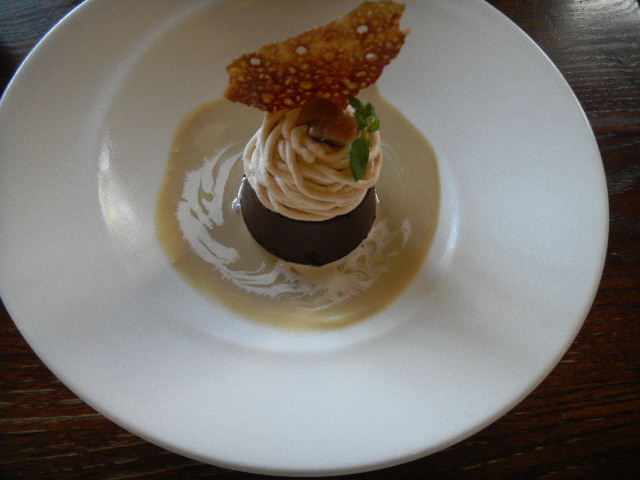 彼女が食べたデザート(dessert)。栗とチョコレートの、モンブラン(Mont Blanc)仕立て。