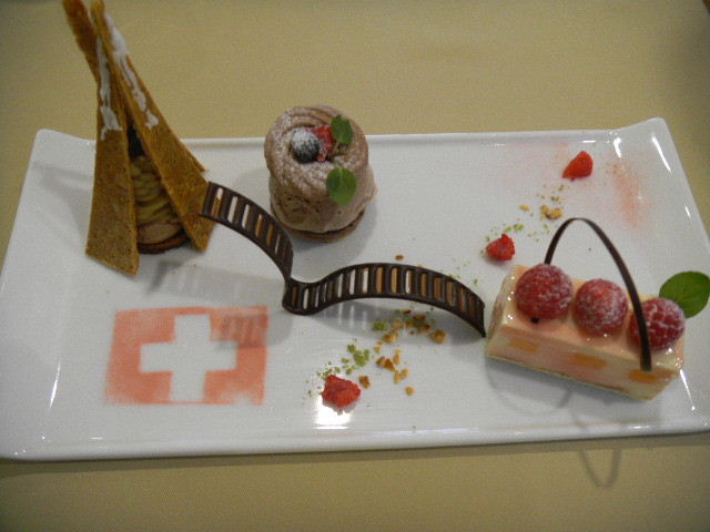 彼女が食べた、期間限定メニュー(menu)の、スイスをイメージしたデザイン(design)の、デザート(dessert)盛り合わせ。今年は、日本とスイスが、国交を樹立してから、150周年である事、箱根(hakone)が、近代以降、(近代において、保養地・観光地開発の先進国であった)スイスを手本にして、保養地・観光地として開発された事、箱根(hakone)登山鉄道(箱根(hakone)areaを走る電車)(1888年開業の馬車鉄道が起源。1900年に電化(電車となる)。1919年に、全線(現在の全ての区間が)開業)と、スイスのレーティッシュ鉄道(Rhaetian