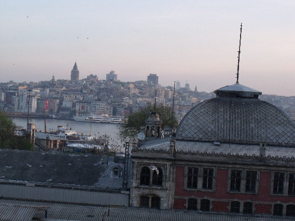 飛行場から地下鉄と路面電車を乗り継いで、昔のオリエント急行の終着駅「シルケジ駅:Sirkeci Garı」裏の 朝飯付き一泊32ユーロ(約4000円)の安宿に泊まりました。 右の建物はシルケジ駅でヨーロッパ側、ボスポラス海峡の向こう側はアジアです。