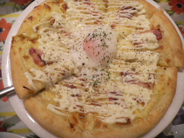 写真以下2枚。カルボナーラ(carbonara)ピザ(pizza)。