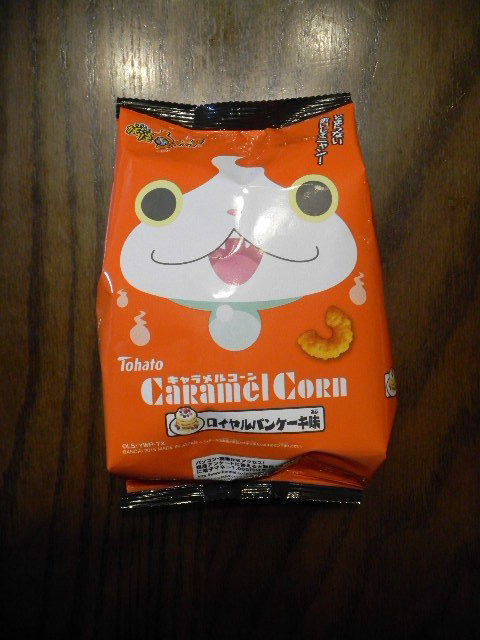 キャラメルコーン(caramel corn)。キャラメルコーン(caramel corn)は、東ハト(tohato)(日本の大規模菓子会社の一つ。1952創業)の主力商品の一つで、結構古くから有る、トウモロコシ(corn)を原料にした、キャラメル(caramel)味が、定番の商品(基本的な商品)の、甘くて柔らかいスナック(snack)菓子です(キャラメルポップコーン(caramel popcorn)とは、全く別の形態のスナック(snack)菓子です)。これは、「妖怪(yokai)ウオッチ(watch)」(現在、日本の子供達に、大人気の、Nintendo 3DS用のゲーム(video game)、漫画、TVアニメシリーズ(TV anime series))の、パッケージ(包装)の、パンケーキ(pancake)風味の、キャラメルコーン(caramel corn)です。