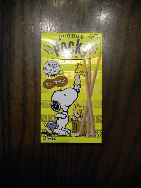 Pocky。Pockyは、1966年に販売が開始された、お菓子で、長い間、日本で、人気の、お菓子となっています。これは、スヌーピー(Snoopy)の、パッケージ(包装)の、甘いピーナッツ(peanut)クリーム(cream)の、Pockyです。