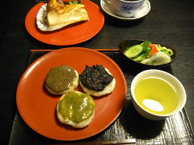 手前、私が食べた、五平(gohei)餅。奥、彼女が食べた、オレンジ(orange)チーズケーキ(cheesecake)。