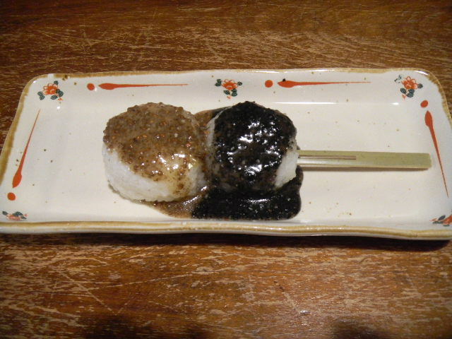 五平(gohei)餅。一つ頼んで、二人で分けて食べました。以下、五平餅(gohei)餅についての説明は、wikiを参考にしました。五平餅(gohei)餅は、長野(nagano)県の南部の山間部(木曽(kiso)area)を始めとする、日本の中部地方南部の山間部の、伝統的な、郷土(地方)料理です。五平餅(gohei)餅は、潰した、ご飯(rice)に、甘いタレ(sauce)(醤油又は味噌に、胡麻、胡桃、砂糖等を加えて作る)をかけ、香ばしく、焼いた(串焼き等にした)、素朴な食べ物です。
