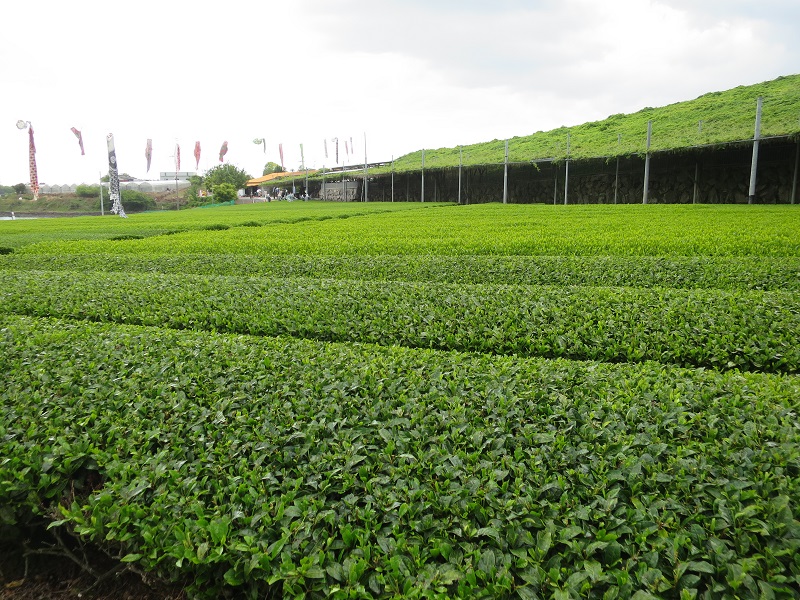 ↑ 本来の目的地のお茶畑です、手前は新茶の若葉が積まれてますが奥の方はこれから摘む新芽です。