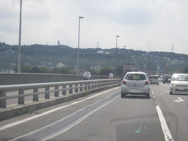 正面に観音様が見えてきました。中央の街路灯の左に立っています。