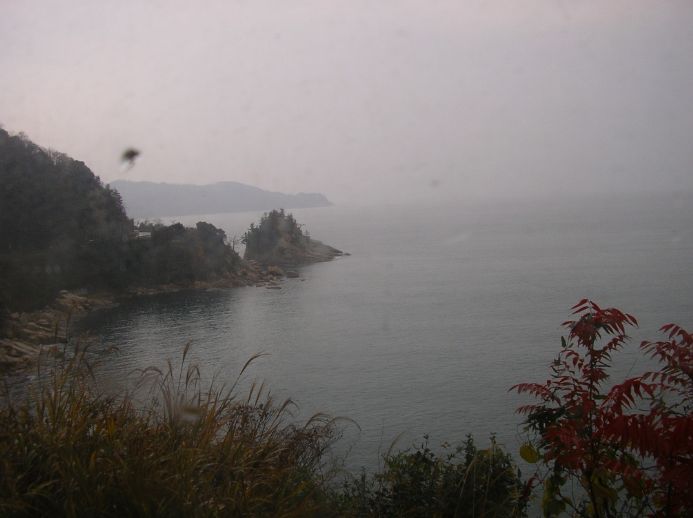 タンゴ悠遊号は景色のいいところでは停車して、景色についての説明もありますが、残念ながら曇天です。