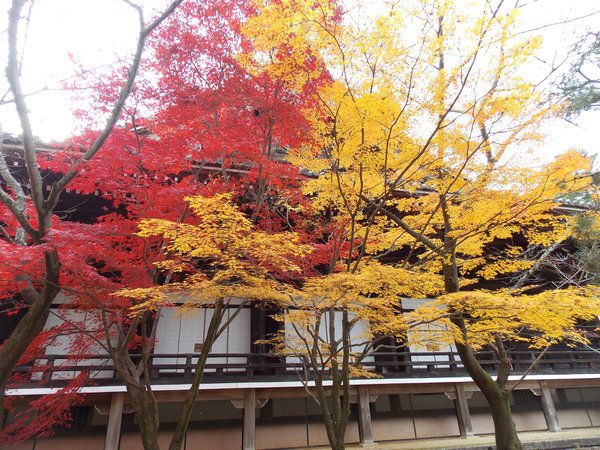 本堂と紅葉。赤と黄色のコントラストが美しい。