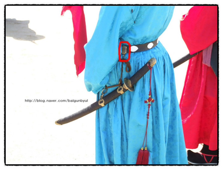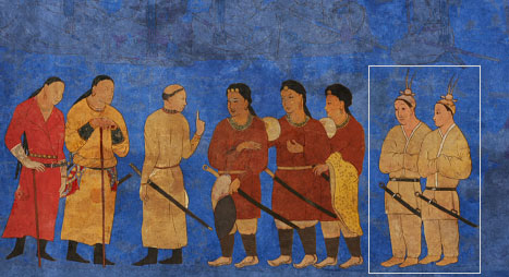 サマルカントアプシアブ宮殿壁画に出ている遭遇官(きじの羽毛をさした管で百済の金銅冠と違い高句麗の臣下たちが頭上に上げた管)を着した高句麗の使臣たちは刀を腰にぶら下げておいている