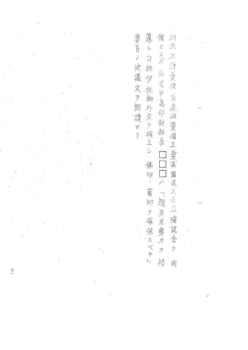 同党にありては六月三十日午後六時より天王寺公会堂に於て対欧方針変改南進政策確立要求国民大会((並))演説会を開催せるが同党半島部副部長□□□は「親英米勢力を掃蕩し日独伊枢軸外交を確立し仏印、蘭印を確保すべき」要旨の決議文を朗読せり