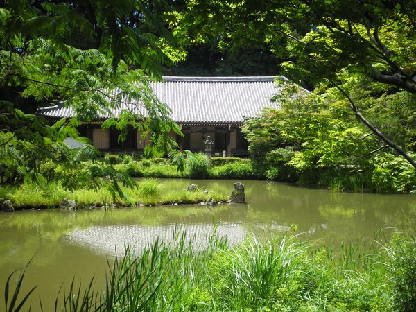池の向こうには木々が鬱蒼と生い茂り、池の右手に本堂が、左手に三重塔が見える。