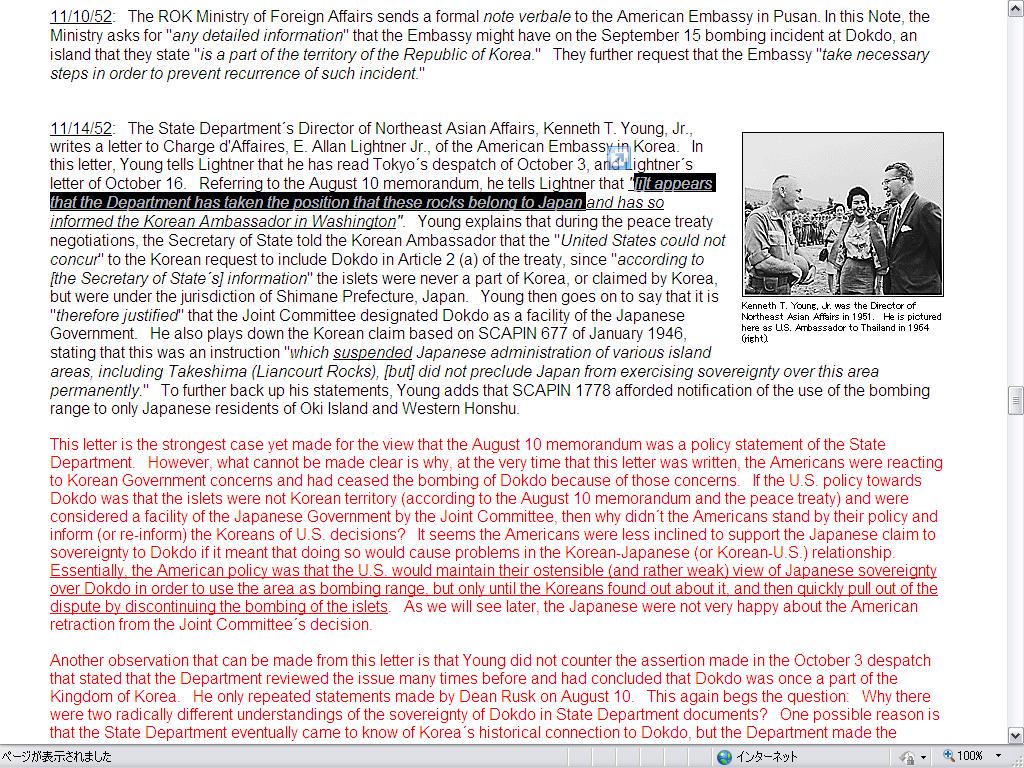 ここでの核心! 君が提示した[A] kemukemu1の [Kenneth T. Young, Jr.,書簡]には/[rocks belong to Japan ]が,元々はなかったということを君が認めなさいと!