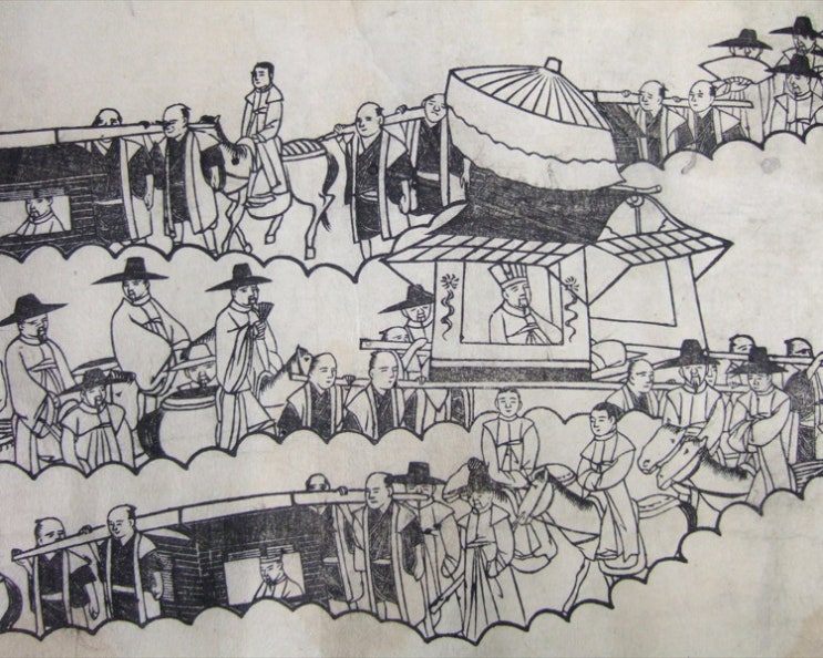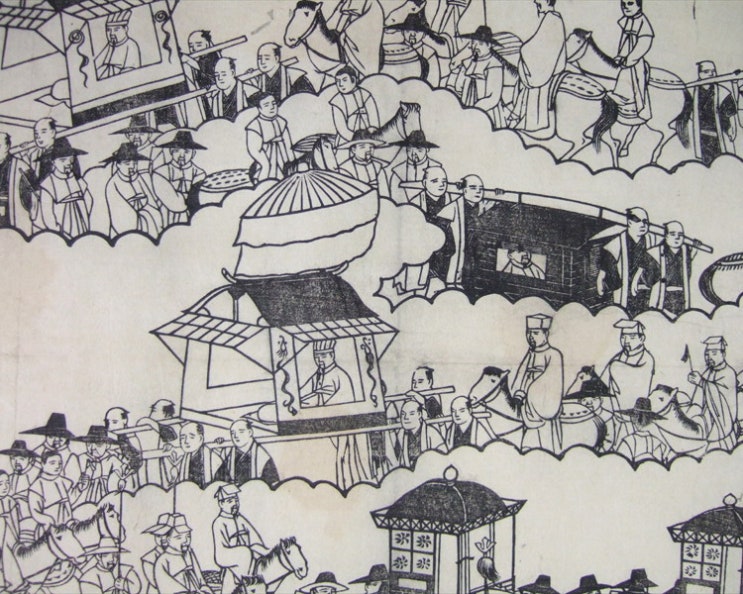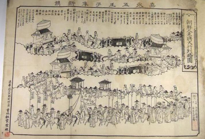 日本江戸時代は 1867年に終わるので本の資料は江戸時代末期に製作されたことになる. 朝鮮時代最後の最後の通信社らの行列姿になる. 倭人たちがお御輿を担いでお御輿には朝鮮通信社らが乗っているし幾多の言葉には通信社一行たちが冠や珍しい調えることが見えて雄大壮厳な行列だったことを見せてくれる.