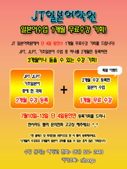 부산일본어학원[JT일본어학원]~7월이벤트 2개월수강시+1개월무료수강