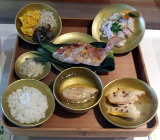 天和 2 년 (1682) 5 대 장군 도쿠가와 쓰나요시의 将軍세습 축하를위해来朝하는 통신사의 정사를 대접한 것을 복원합니다. “引替本膳”등에서 식사에 나오는 “三の膳”를 기본으로室津같은 것을 몇 제품 선택했습니다. 생선회,카바야끼(뱀장어·갯장어·미꾸라지 따위의 등을 갈라 뼈를 바르고 토막쳐서 양념을 발라 꼬챙이에 꿰어 구운 요리),(채소·생선·조개 등을) 된장·식초·깨·겨자 등으로 무친 것,香物을 함께 하나의 소반에 차렸습니다.