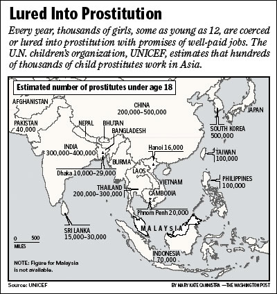 워싱턴 포스트는 지난 8월 23일 “강제노역에 팔려간 인생들”이란 제목으로 아시아의 인신매매와 매매춘 실태를 보도하면서 유니세프 통계자료를 활용했다면서 이같은 내용이 담긴 지도를 함께 실었습니다.