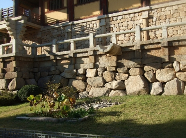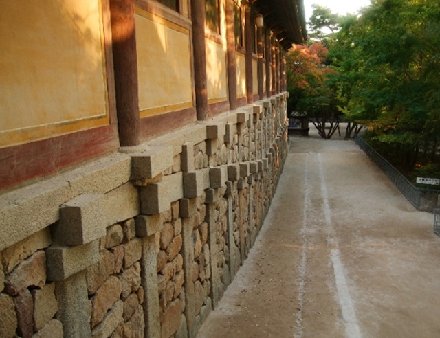 仏国寺の最大の特徴だと言える 大石壇は浮石寺や他の住んでから査察でも見られるが大きい冷たくは仏国寺は人工美を適切に具現したことなのに 石を木のように 長く整えて合わせてネモカンを作ってその中に他の大きさの自然石を満たした. 南側の階段部分は精巧に整えた石で合わせて人工美を具現したし大雄殿領域の前の石段には自然石を積んでその上のデコボコした 模様に合わせて削った人工席で挟んで下の団を完成して人工美と自然美が調和を成すようにしたし極楽殿領域とレベルの差を置いて 泛影樓の突き出させて立体的に構成しながら単純な中変化を与えて絢爛たる感じを与えるがよくよく見れば全体的に整然としている感じを与える.