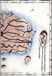 1834년의 울릉도의 지도(서울 대학규장각 소장).우측에는 거리를 나타내는 눈금이 있어, 「우산」이라고 쓰여진 우측의 섬이 왼쪽에 있는 울릉도와 접근하고 있다는 것을 알수 있다