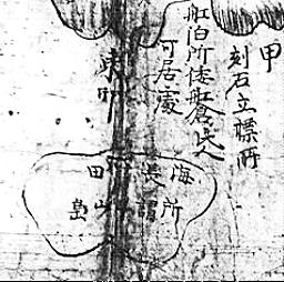 연대 미상의 울릉도의 지도(서울 대학규장각 소장).울릉도(상부)아래에 「소위우산도(所謂于山島))」라고 쓰여진 섬에는 「해장죽전(海長竹田)」의 문자가 있다고 지적한다