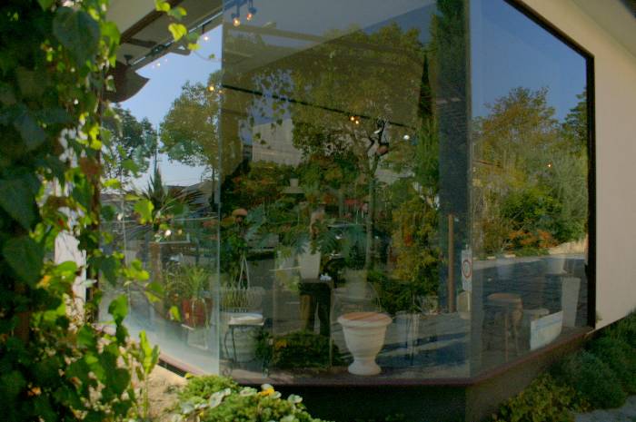 イタリーレストラン付属の花屋のウインドウ カメラを構えている私がかすかに写っている・・・