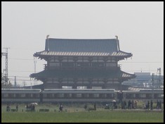 正面玄関の「朱雀門」から宮殿の「大極殿」に続くメイン道路の間にありますが、踏切はありません(笑)