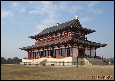 「平城宮」そして「平城京」の中心に位置する「大極殿」です。これは復元されたものです。朱色と白のコントラストがなかなか美しい。