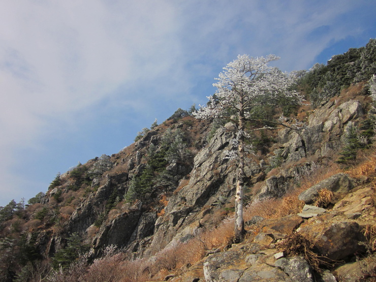 高く上がるほど傾斜は急になって木には雪花が咲いている.
