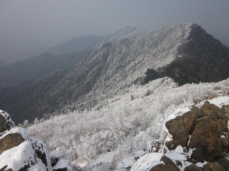 天王峯てっぺんに立つと支えることがない望むことは四方でとても激しくブルオデンダ. てっぺんには ¥"智異山天王峯 1915m¥", 裏には ¥"韓国人の気象, ここで発源される¥"と書かれた碑石が立っている. 日は曇って雪が積もって完全な冬の中にある.