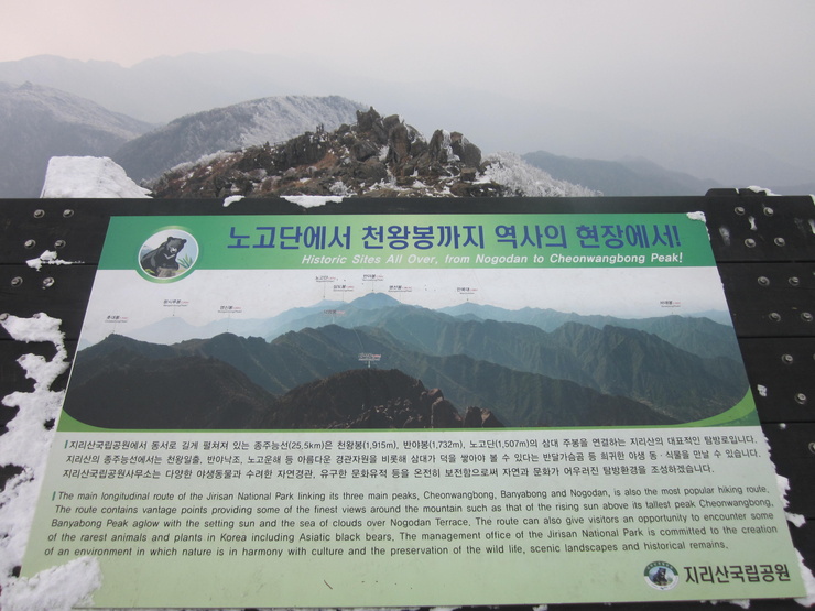 智異山は多くの人々が捜して東西に縦走する人々も多い. 智異山には 20個以上の 1500mの過ぎる峰たちがあり 天王峯てっぺんの表示板にはこちらで見える多くの峰たちの説明写真がある.