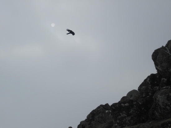 바위 밖에 없는 외로운 정상 위에 까마귀 몇 마리만이 허공을 맴돈다.