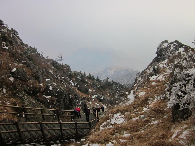 높이 올라갈 수록 경사는 급해지고 나무에는 눈꽃이 피어있다.