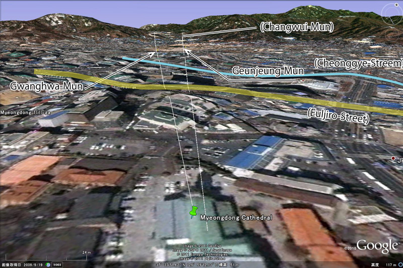 この原理によってGoogle Earth上に視点(明洞聖堂)