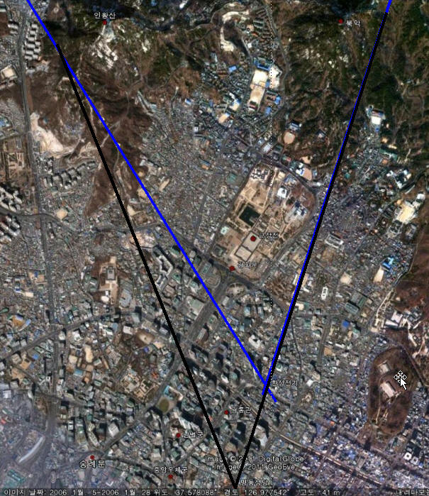 일본인들이 위치를 말하지 않고 있지만 한성전기라고 가정해서 사진4의 시야각을 보면 청색선은 50도의 각도를 가지고 있다.