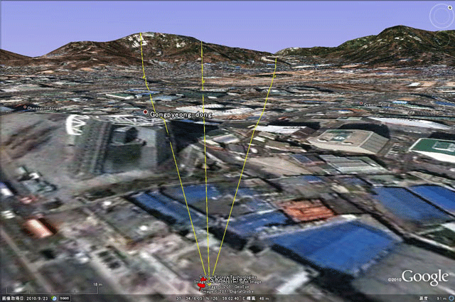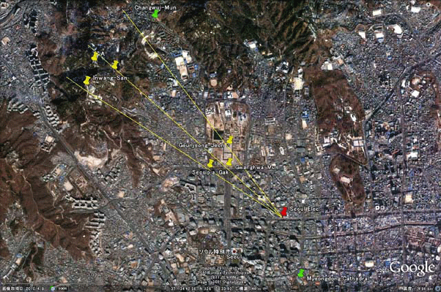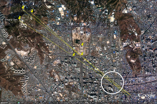 E地点は光化門の直上に観察される(余談だが同地点には漢城の城壁が通っている)。
