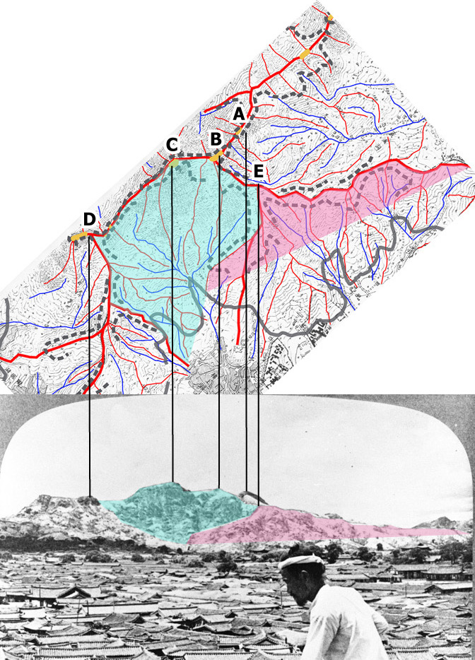 E지점은 광화문의 바로 윗쪽에 관찰된다(여담이지만 도우지점에는 한성의 성벽이 지나고 있다).