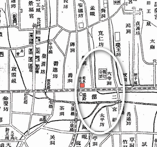 その左の小さな家を挟んだ隣がにある正方形の建物が,漢城電気会社。